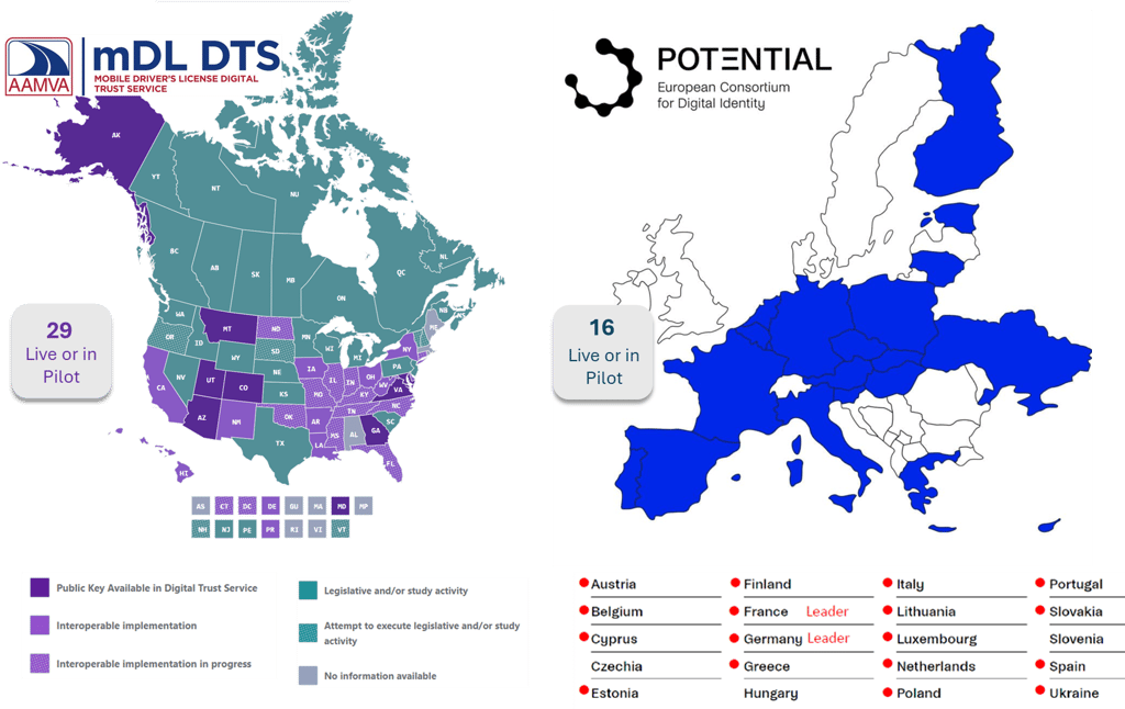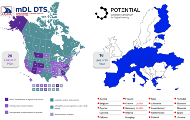 With Europe, North America, Australia, Japan, Philippines and many other countries now considering or implementing ISO/IEC standards, we assist organisations in ensuring they can also stay interoperable globally by adopting the same standards. The figure shows the adoption of the ISO/IEC 18013-5 mobile Driver Licence standard across Europe and North America.